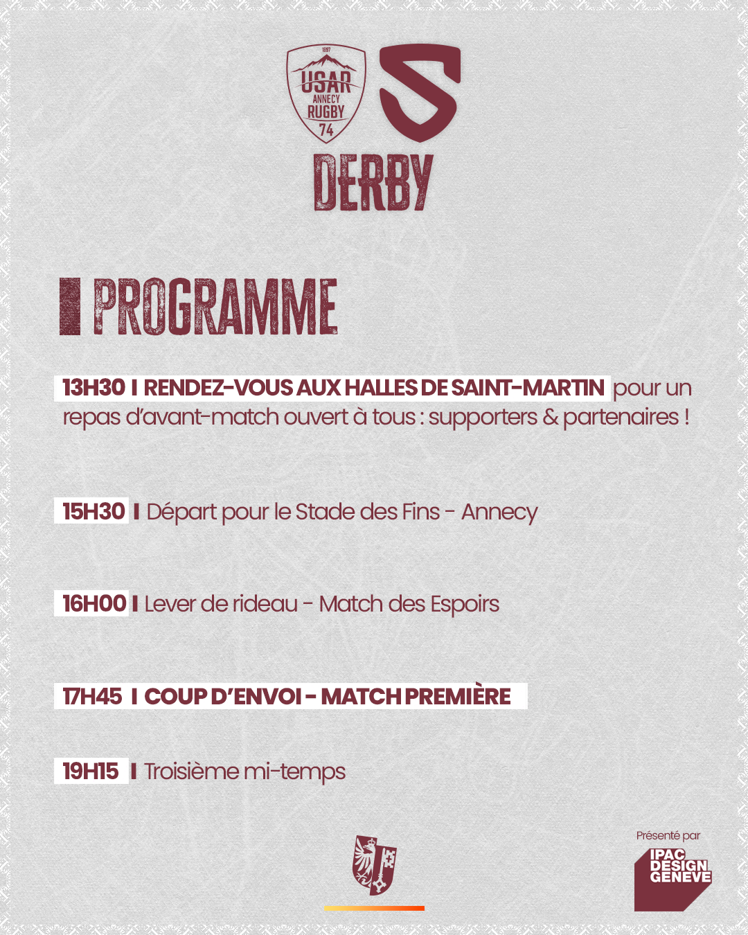 A cette occasion, et pour venir nombreux encourager nos Grenat, nous vous invitions à partager un moment convivial avant le match (dès 13h30) aux Halles de Saint-Martin (58 Rte des Sauts, 74370 Fillière, France, situé à 10 minutes du Stade des Fins à Annecy). Restauration sur place à discrétion. Pas d’inscription, ouvert à tous : supporters et partenaires !